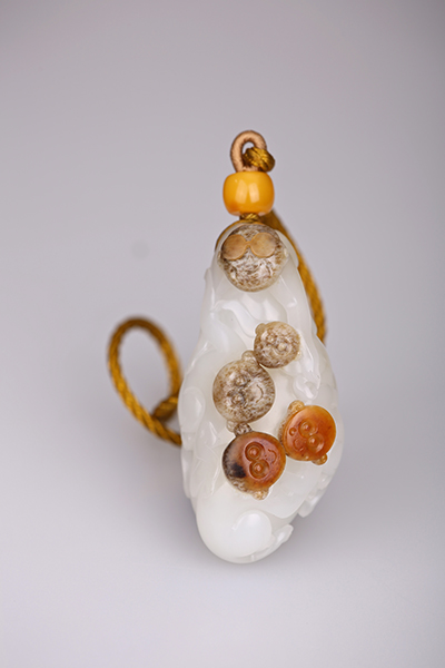 作品采用黑红皮籽玉,巧妙运用皮色分层,俏色出五只猴子。每只猴头颜色略有不同,一只老猴还顽皮的戴着墨镜。五只猴子相拥,一团和气。